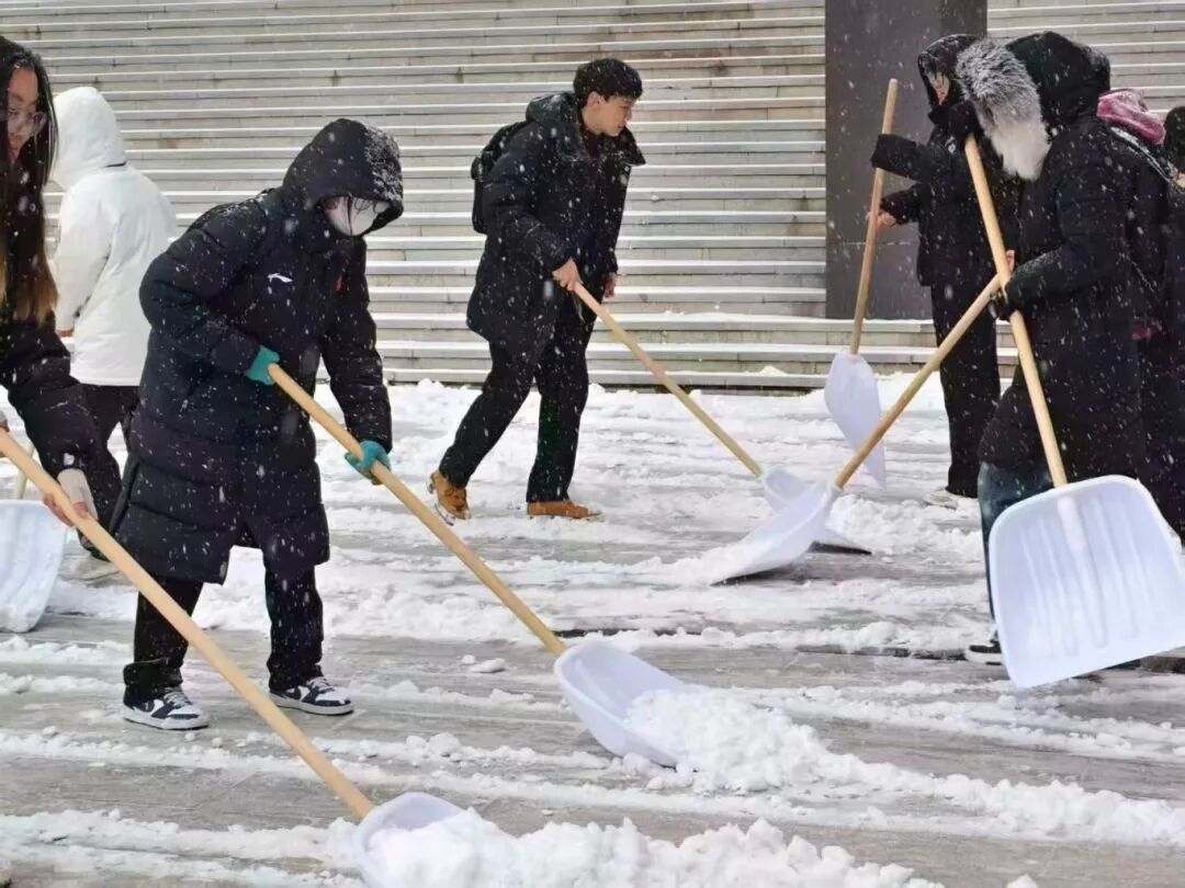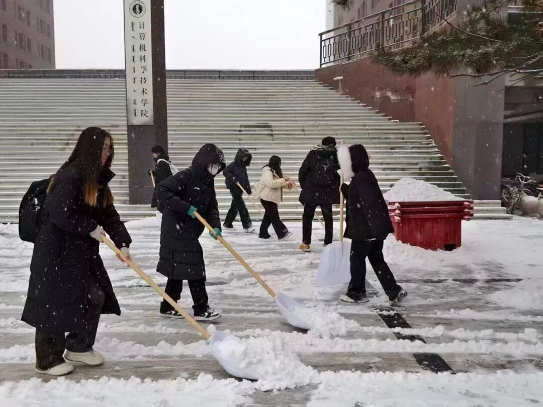 虽然气温较低,寒风凛冽,但同学们不畏严寒,干劲十足。志愿者们手持铁锹、扫帚等工具,对qy球友会楼前、教学楼周边以及宿舍区主干道的积雪进行了集中清理。大家分工协作,配合默契,铲雪、推雪、清扫……一个个忙碌的身影在雪地中构成了一道温暖的风景线。劳动过程中,同学们团结互助,展现了昂扬的劳动热情和积极的精神风貌。