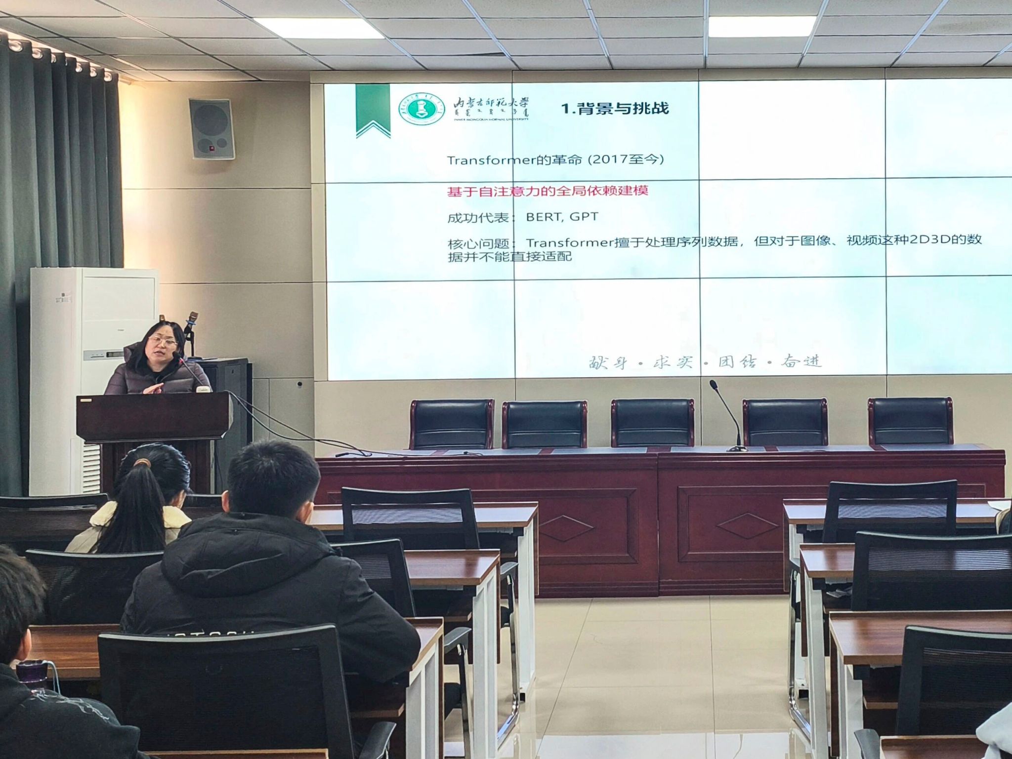在题为《视觉Transformer的演进:从ViT到CSWin》的报告中,张翠副教授条分缕析地回顾了视觉Transformer从ViT(Vision Transformer)起源至今的关键进展。她首先解析了ViT的基础架构与工作机制,及其在图像分类中带来的重要影响;随后延伸至PVT、Swin Transformer等代表性优化模型,并重点阐释了CSWin Transformer所采用的跨窗口自注意力机制,及其在提升模型表达能力和任务适应力方面的显著优势。通过典型应用实例,张教授进一步呈现了视觉Transformer在图像识别、检测与分割等多类视觉任务中的实用价值与发展潜力。整场讲座逻辑清晰、例证充分,有效调动了师生的思考与互动热情。
