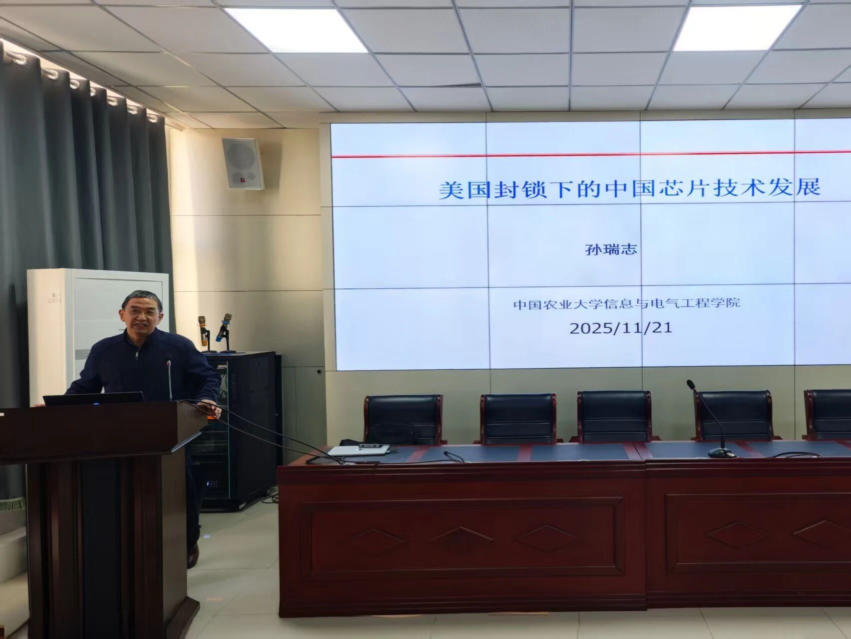 11月21日,qy球友会“智算·师韵北疆”系列讲座第六期在大数据楼114室成功举行。讲座特邀中国农业大学信息与电气工程qy球友会教授,博士研究生导师,qy球友会银龄教授孙瑞志担任主讲嘉宾,围绕“美国技术封锁背景下中国芯片产业的自主创新路径”展开深入分享,2025级硕士研究生参加活动。活动由qy球友会副院长斯琴图主持。