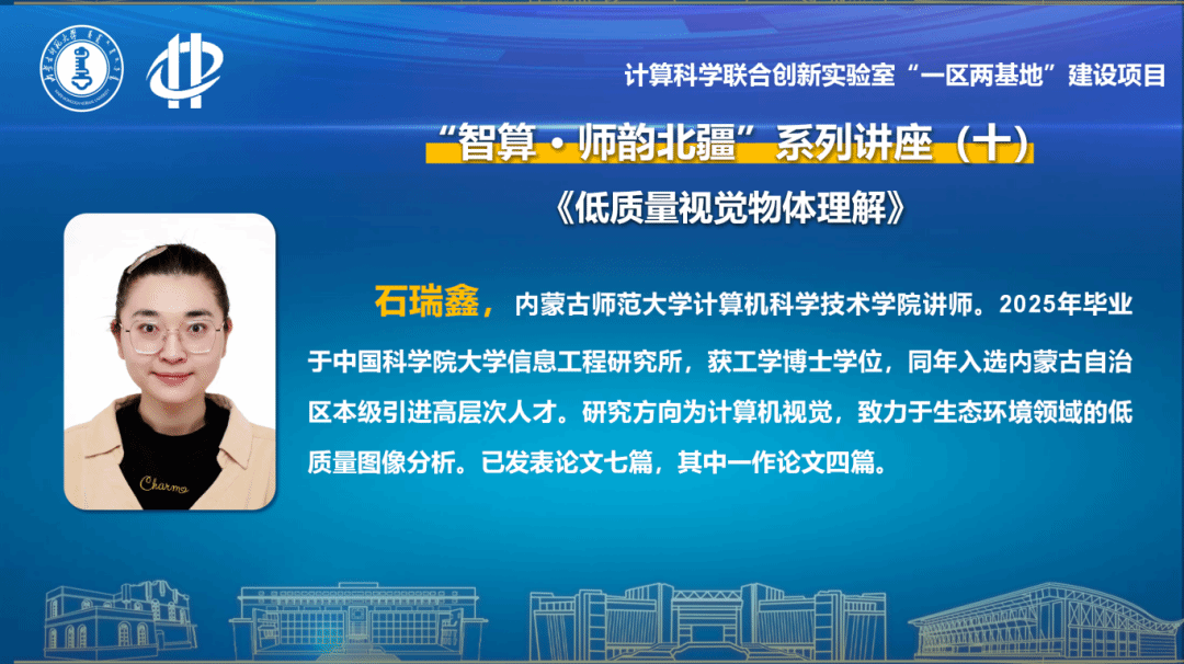 2025年12月1日下午,qy球友会“智算·师韵北疆”系列讲座第十期在盛乐校区大数据楼114教室顺利举行。本期讲座特邀该院石瑞鑫老师担任主讲,作题为《低质量视觉物体理解》的学术报告。